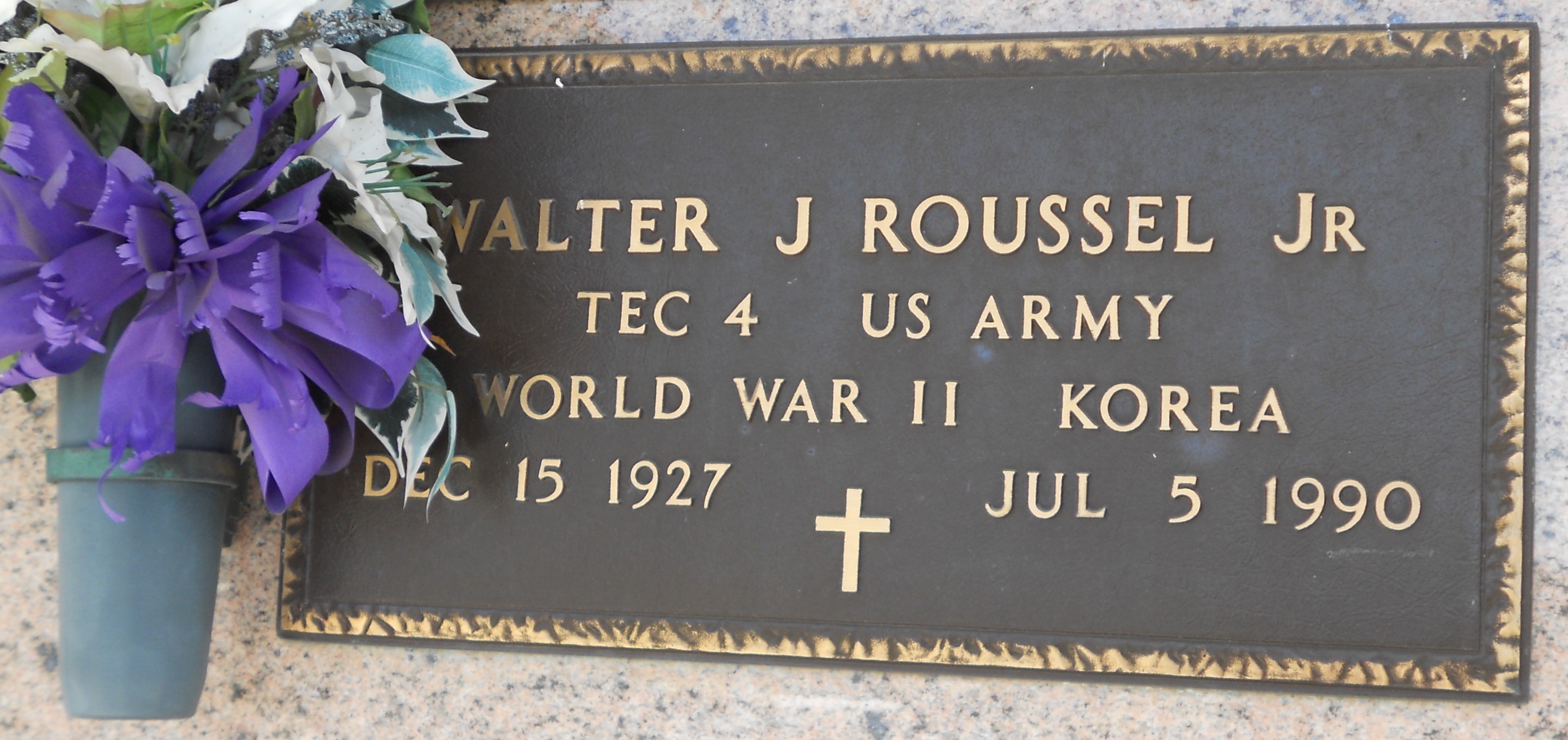 | Roussel | Walter J Jr | 12/15/1927 | 7/5/1990 | Lois Austin | WW II, Korea TEC 4 US Army | Tm T-Lo | ||