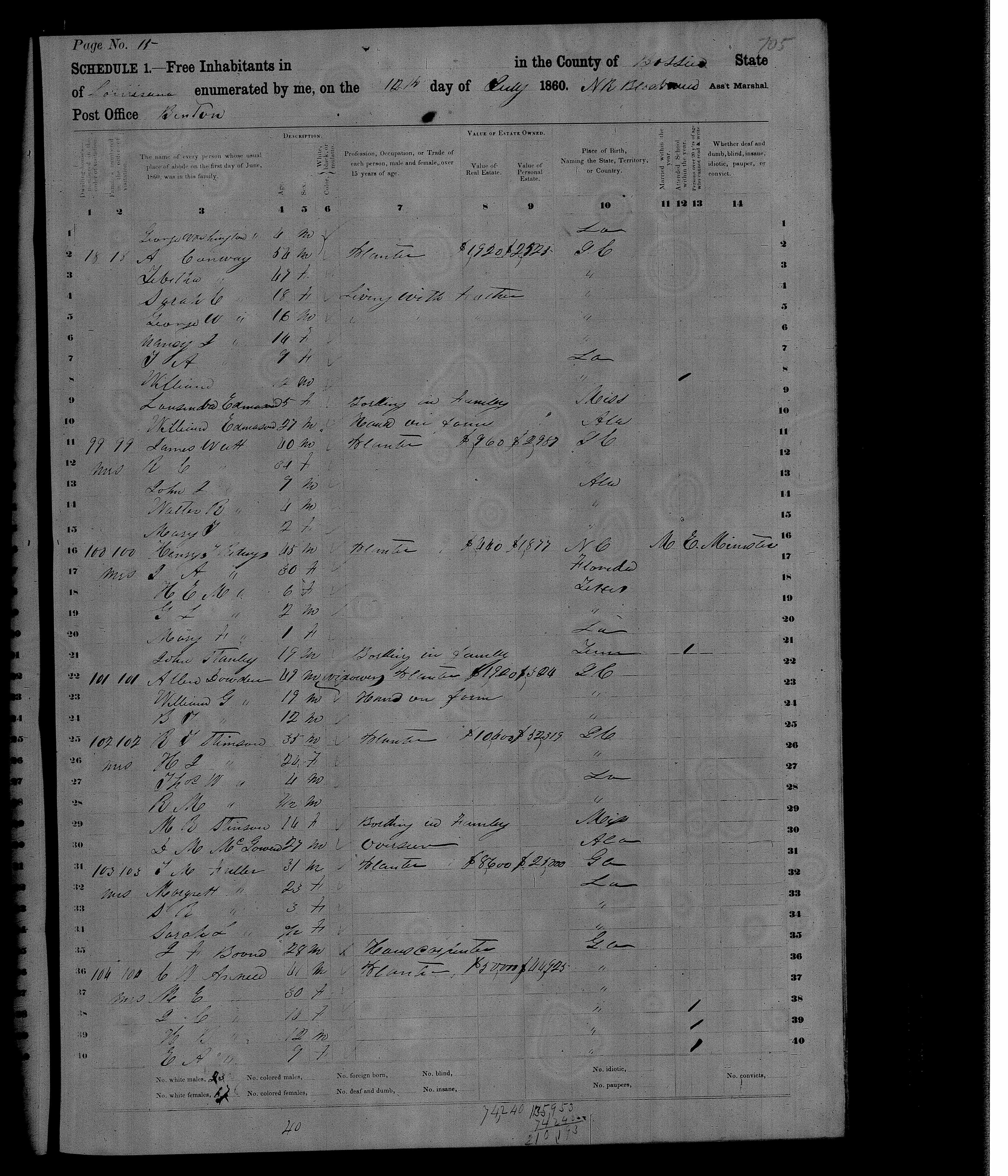 1860 Census, Union Parish, LA