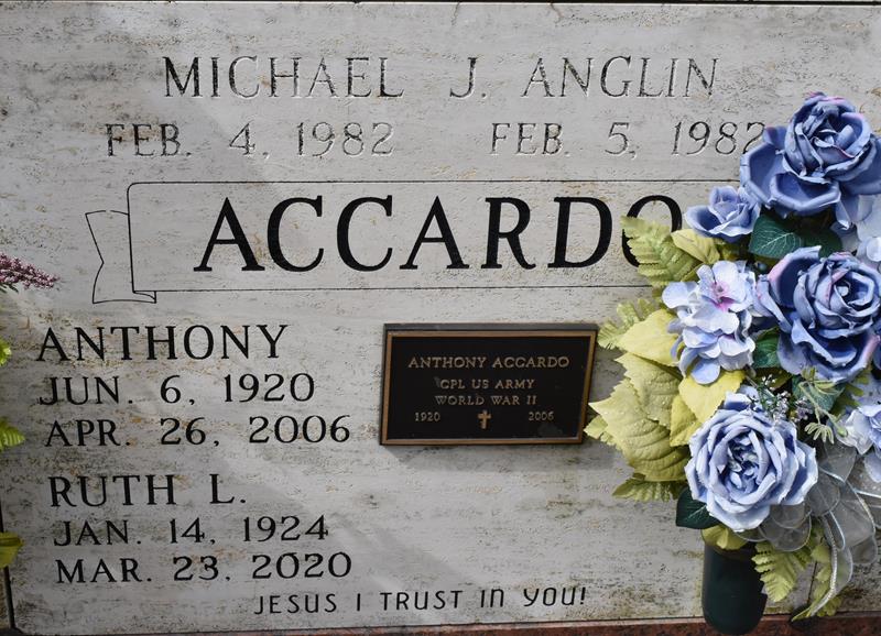 | Accardo | Anthony | 6/6/1920 | 4/26/2006 | Ruth Louque | Joseph & Mattia Cashio Accardo | WW II Cpl US Army | obit | photo |