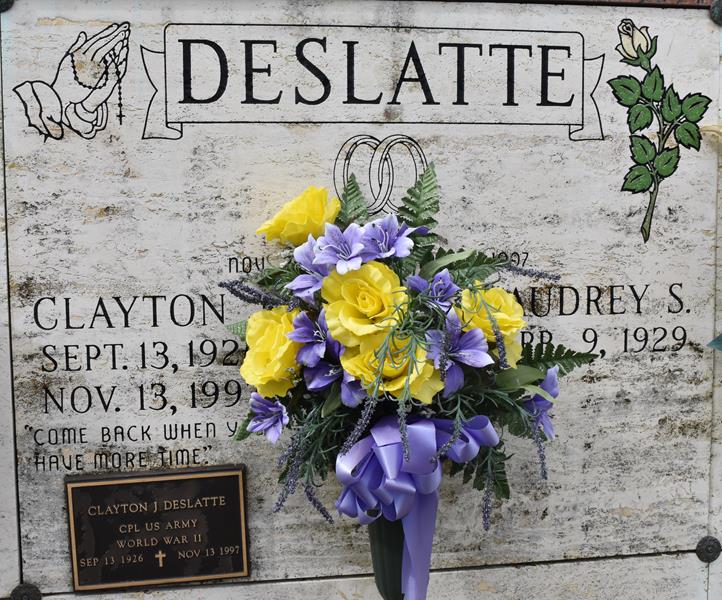 | Deslatte | Clayton J | 9/13/1926 | 11/13/1997 | Audrey S | Maurice L & Melba Roussel Deslatte | WW II Cpl US Army | photo | |